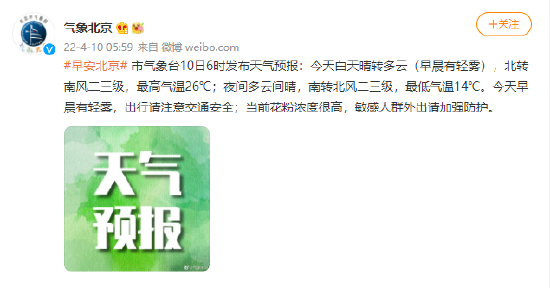 市气象台10日6时发布天气预报:今天白天晴转多云(早晨有轻雾),北转南风二三级,最高气温26℃;夜间多云间晴,南转北风二三级,最低气温14℃。今天早晨有轻雾,出行请注意交通安全;当前花粉浓度很高,敏感人群外出请加强防护。