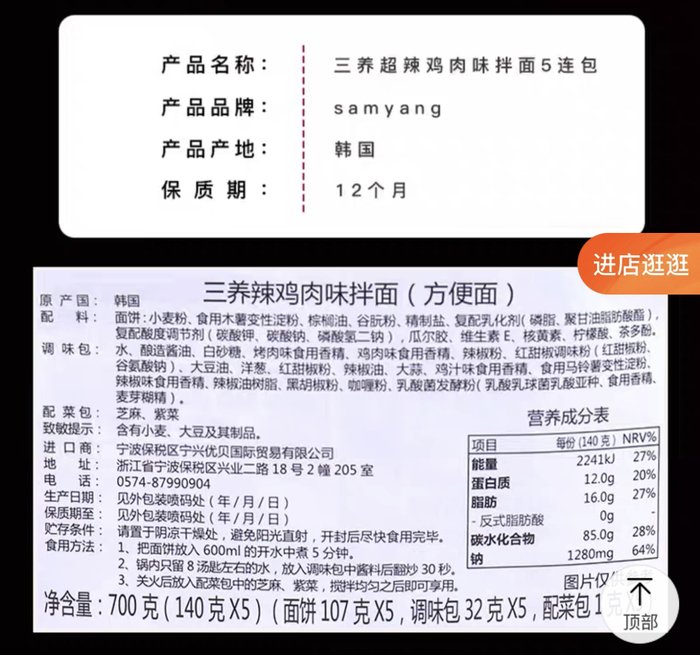 此外,三养食品天猫旗舰店主页显示,“超辣鸡肉味拌面”(即“火鸡面”)产地为韩国,保质期为12个月。