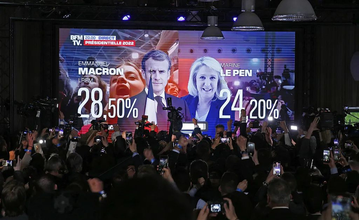 当地时间2022年4月10日,法国巴黎,根据法国媒体10日晚公布的出口民调结果,现任总统埃马纽埃尔·马克龙和极右翼政党“国民联盟”候选人玛丽娜·勒庞在当天举行的法国总统选举首轮投票中得票领先,将进入第二轮投票。