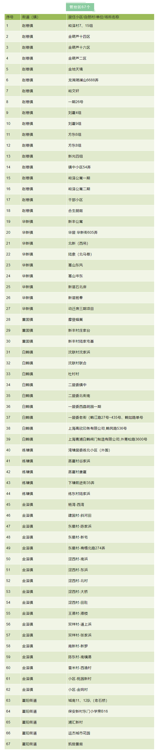 5。庄行镇:浦秀村、渔沥村、吕桥村、马路村、丽水湾社区居民区、沙港湾社区居民区、庄行社区居民区、庄行新苑第一社区居民区、牡丹里社区居民区、邬桥社区居民区(除耀光小区、汇安小区、邬康路27号)、新叶村(除一期、二期)、西校村(除4组)、汇安村(除相计1组)、张塘村(除牛桥9组)