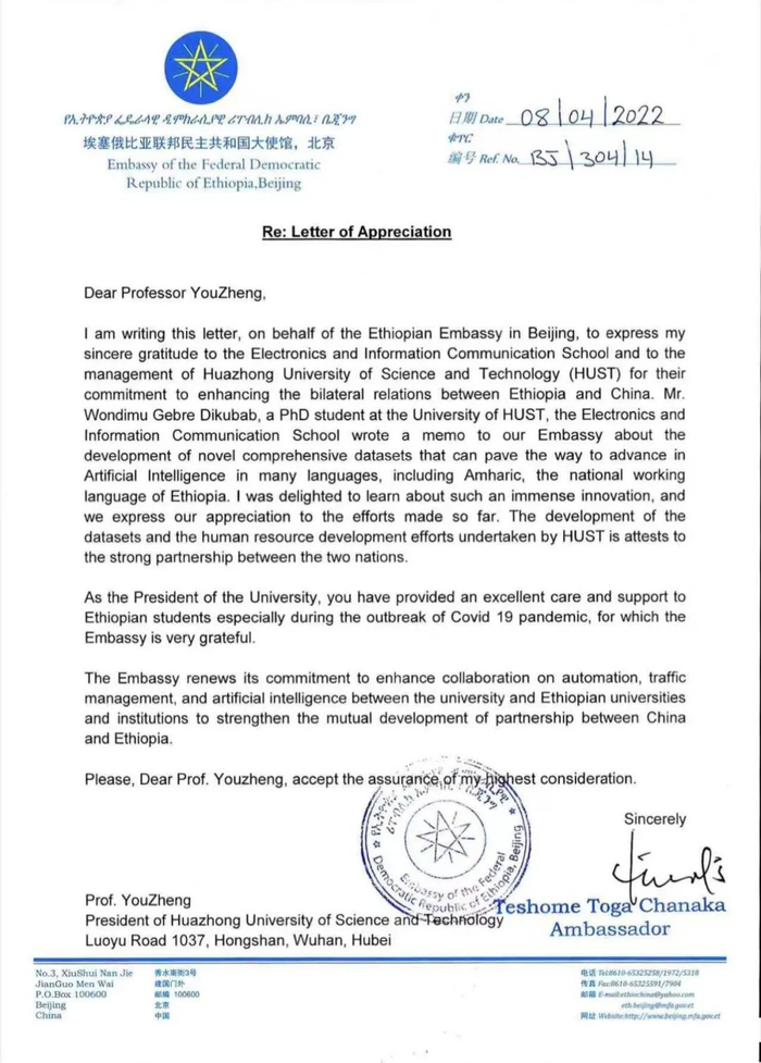 这个国家大使馆给华中科技大学发来感谢信!