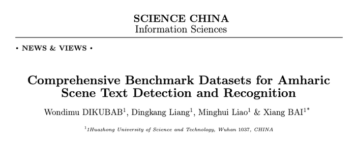 近日,在人工智能与自动化学院教授、测控技术“一带一路”联合实验室副主任白翔的指导下,王兴发布了首个阿姆哈拉语场景文字检测与识别综合公共数据集和初步的算法解决方案。其论文“Comprehensive Benchmark Datasets for Amharic Scene Text Detection and Recognition”发表在国内计算机领域顶级期刊SCIENCE CHINA Information Sciences上。