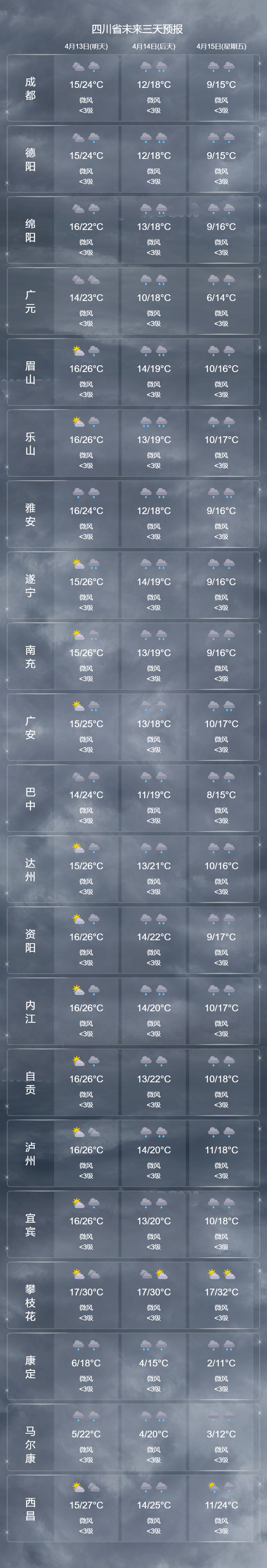 13日四川大部多云转阴;13日夜间开始至16日,四川有一次降温降水天气过程,日平均气温将累计下降6~9℃。