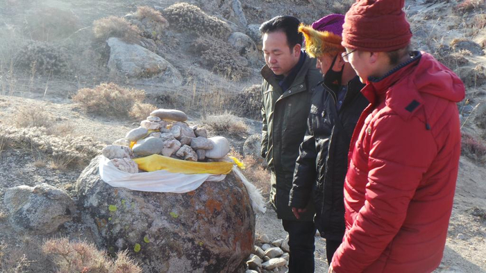 2015年1月,索南多杰(左一)在海南藏族自治州共和县调研格萨尔风物传说。受访者供图