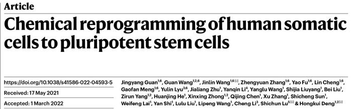 北京时间4月13日23时,顶级学术期刊《自然》(Nature)在线发表了北京大学博雅讲席教授、干细胞研究中心主任邓宏魁团队的一项最新研究,题为“化学重编程人类成体细胞为多能干细胞”( Chemical reprogramming of human somatic cells to pluripotent stem cells)。这项突破性研究成果首次在国际上报道了使用化学小分子诱导人成体细胞转变为多潜能干细胞,实现了人体细胞发育过程的“大逆转”。