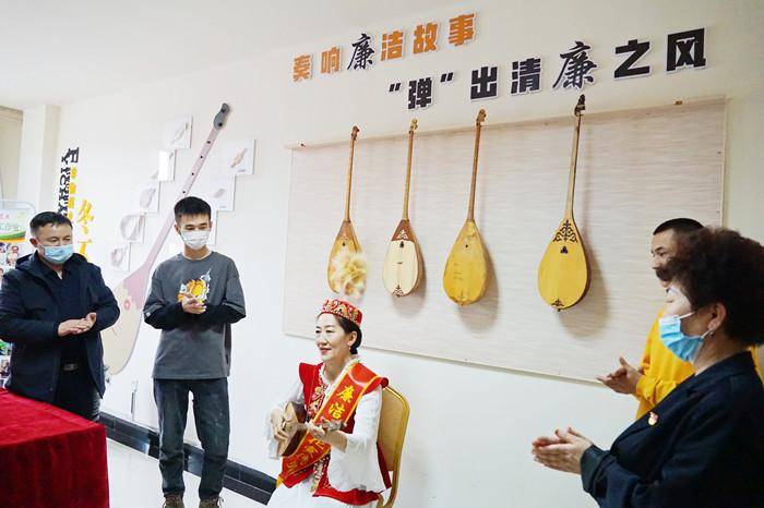 托里县托里镇拜格托别社区活动室内,民间艺人用哈萨克族传统乐器冬不拉,弹唱着廉洁歌曲,居民在享受音乐之美的同时,潜移默化地接受廉洁文化熏陶。(张洁 摄)