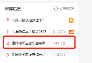 继昨天(13日),康师傅老坛酸菜方便面重回货架冲上微博热搜第一后,4月14日,康师傅的回应又登上热搜。
