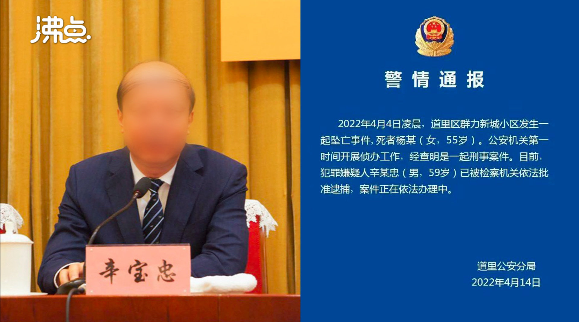 4月14日晚间,哈尔滨市公安局道里区分局发布警情通报:4月4日凌晨,道里区群力新城小区发生一起坠亡事件,死者杨某(女,55岁)。公安机关第一时间开展侦办工作,经查明是一起刑事案件。目前,犯罪嫌疑人辛某忠(男,59岁)已被检察机关依法批准逮捕,案件正在依法办理中。