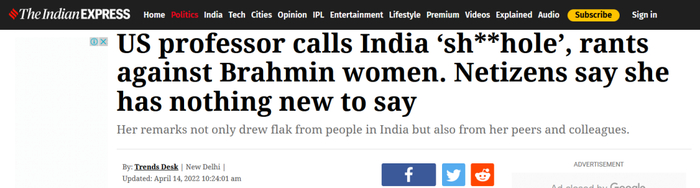艾米特地用印度的婆罗门女性做例子,“我们给了她们一个机会,但现在她们却回过头来带头指责我们是‘种族主义者’,说我们是一个糟糕的、急需改革的国家”、“问题就在这里。她们被教导说,她们比其他人都好,因为她们是婆罗门精英。但在某种程度上,她们的国家就是一个粪坑,请原谅我这么说。”