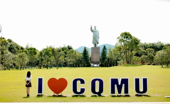 在毛爷爷雕像和"CQMU"的交相辉映下