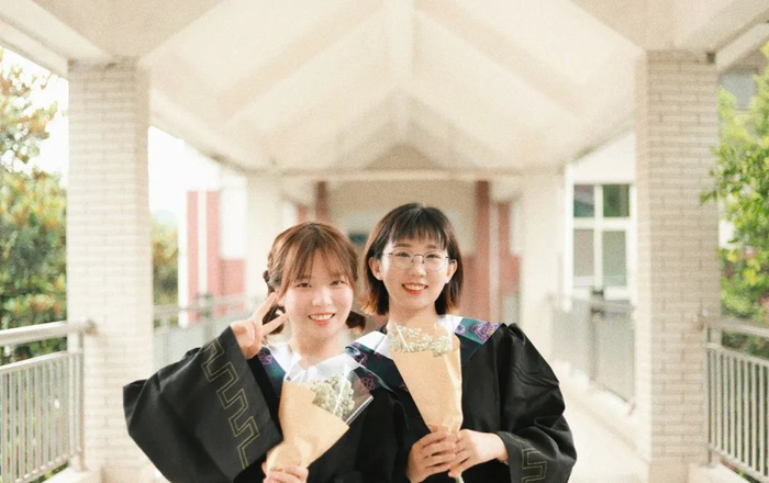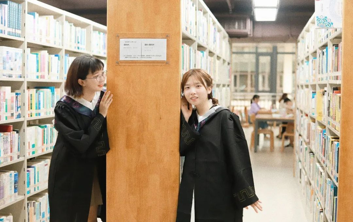 暖黄的书架配上黑黑的学士服