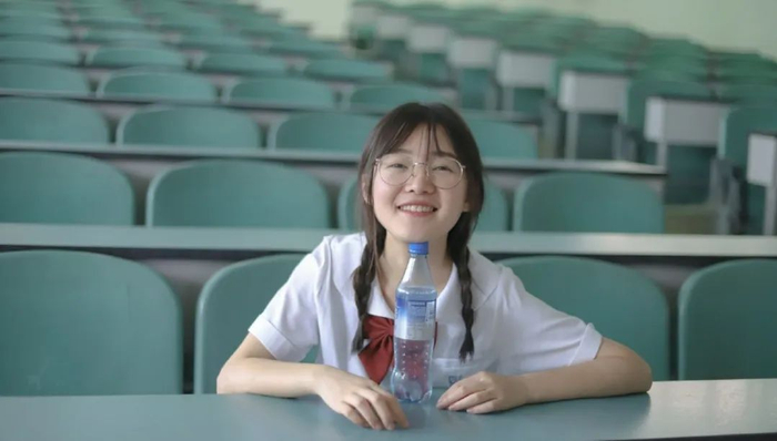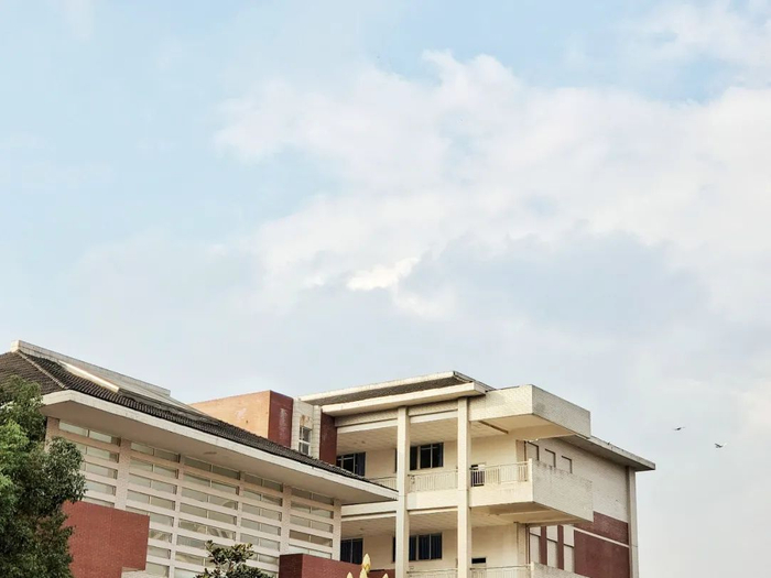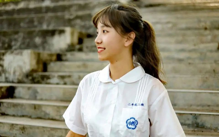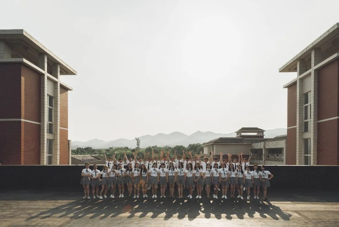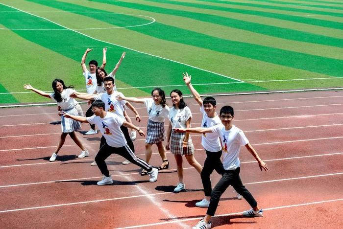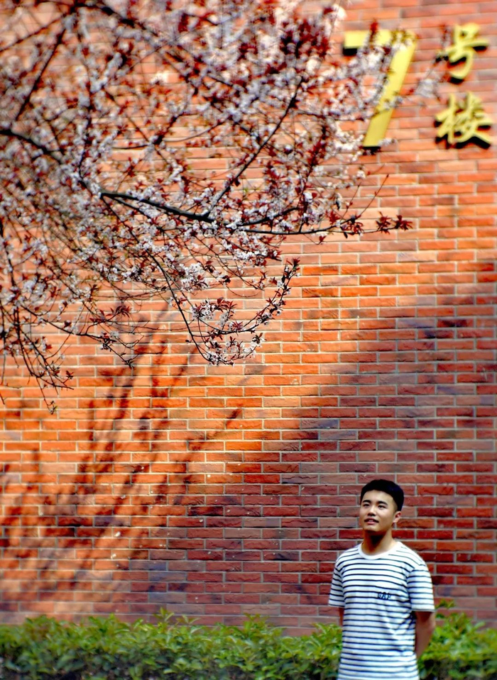 以红白相间的教学楼墙面为背景