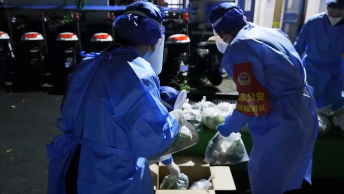 4月14日夜,杨浦公安分局各派出所民警开始忙碌地分拣蔬菜瓜果,为第二天的“送菜上门”做足准备。疫情封控期间,一些老人因为不会用智能手机网购,可能出现生活物资短缺的情况。为此,分局决定从自己的保障物资中分出一部分来,送给辖区里的独居老人。