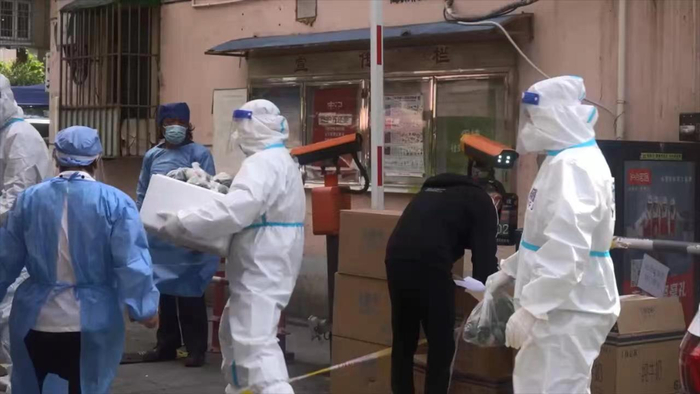 杨浦区三门路某小区内,五角场派出所社区民警谢明萱正与社区志愿者一起“爬楼”送菜,提醒着老人们要保持足不出户,配合防疫工作。由于阳性病例较多,3月底她就把铺盖从单位搬进了这个小区。在4000多人居住的小区里,她化身“大管家”,与105位志愿者一起奔波奋战,尽全力服务群众。
