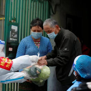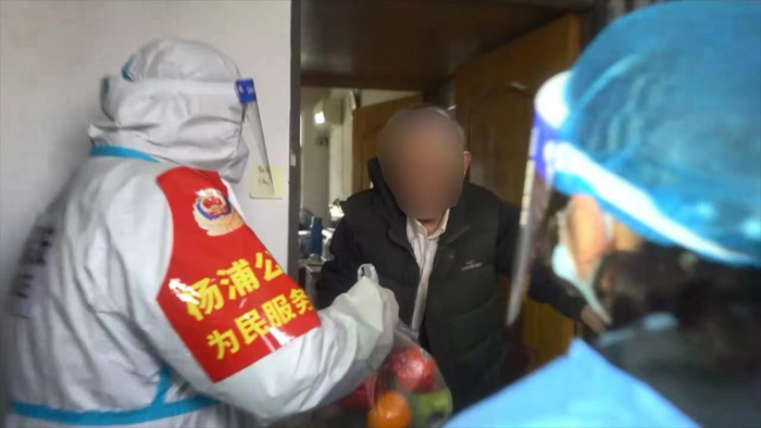 4月15日,上海杨浦国年小区一居民楼内,杨浦公安分局五角场派出所民警徐晖将一份包含新鲜蔬菜、鸡蛋、水果及防疫物资的“爱心大礼包”递给了独居在家的高龄老人。