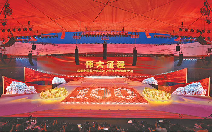 一百年来,中国共产党始终践行初心使命,团结带领全国各族人民绘就了人类发展史上的壮美画卷。图为2021年6月28日晚,庆祝中国共产党成立100周年文艺演出《伟大征程》在国家体育场盛大举行。 新华社记者 邢广利/摄