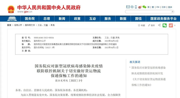 4月11日,国务院应对新型冠状病毒感染肺炎疫情联防联控机制印发《关于切实做好货运物流保通保畅工作的通知》。通知要求,严禁擅自阻断或关闭高速公路,不得擅自关停高速公路服务区,要优化防疫通行管控措施,切实保障重点物资和邮政快递通行。此外还提出了一揽子财税金融政策。