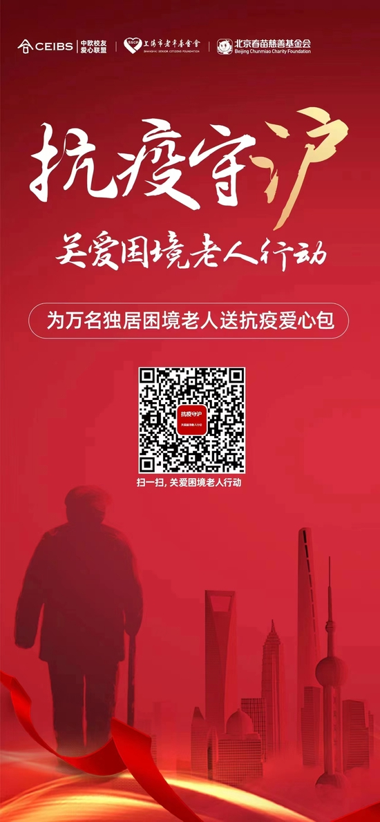 近日,“抗疫守沪,关爱困境老人行动”项目由中欧校友爱心联盟发起,由上海市老年基金会、上海科技助老服务中心共同执行。项目以筹集到100万元为目标,其所有善款将全部用于抗疫爱心包的采购,以此共同关爱在上海疫情中的困境独居老人,帮助他们渡过难关。