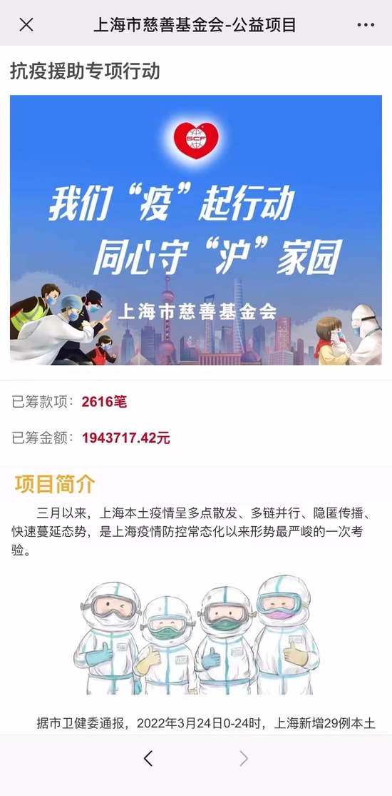 上海市慈善基金会于3月26日开启“抗疫援助专项行动”线上募捐通道。此前,基金会已通过存量资金为社区一线援助了价值超过千万元的各类抗疫物资。通过开通各处线上线下公募渠道,基金会将筹集到的款物全部定向用于上海社区抗疫一线的援助以及抗疫一线工作人员的慰问。截至2022年4月17日8时,上海市慈善基金会已通过上述专项行动的募捐通道,收到2616笔捐赠,总金额1943717.42元。