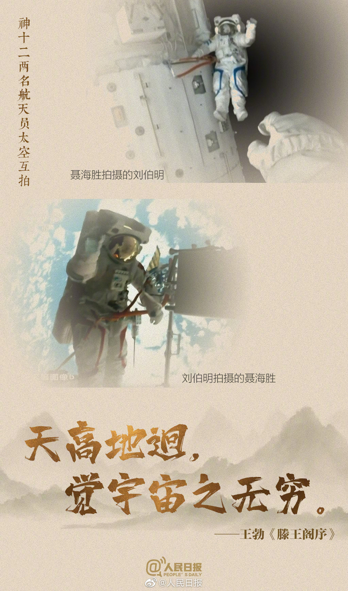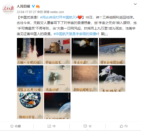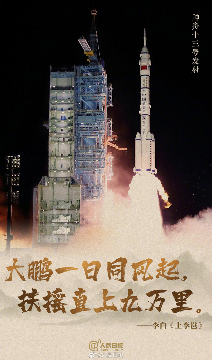 [中国式浪漫!用古诗词打开中国航天]16日,神十三乘组顺利返回地球。古往今来,无数文人墨客写下了对宇宙的浪漫想象,当“宇宙之无穷”映入眼帘,当“手可摘星辰”不再夸张,当“大鹏一日同风起,扶摇而上九万里”成为现实,浩瀚宇宙见证着中国人的浪漫。中国航天就是宇宙级的浪漫!戳↓↓