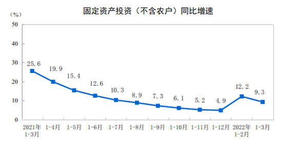 4月18日,在国务院新闻办举行的一季度国民经济运行情况新闻发布会上,国家统计局新闻发言人、国民经济综合统计司司长付凌晖介绍了2022年一季度国民经济运行情况,他表示,一季度全国固定资产投资(不含农户)104872亿元,同比增长9.3%。其中,民间固定资产投资59622亿元,同比增长8.4%。从环比看,3月份固定资产投资(不含农户)增长0.61%。