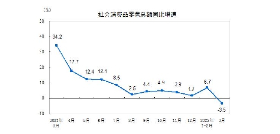 3月社会消费品零售总额34233亿元,同比下降3.5%