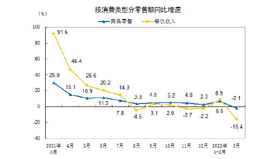 按消费类型分,一季度商品零售98006亿元,同比增长3.6%;餐饮收入10653亿元,增长0.5%。3月份,商品零售31298亿元,同比下降2.1%;餐饮收入2935亿元,下降16.4%。