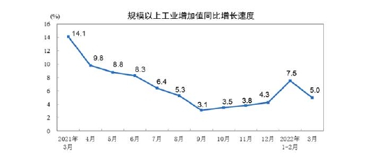 4月18日,在国务院新闻办举行的一季度国民经济运行情况新闻发布会上,国家统计局新闻发言人、国民经济综合统计司司长付凌晖介绍了2022年一季度国民经济运行情况。他表示,3月份,规模以上工业增加值同比实际增长5.0%(以下增加值增速均为扣除价格因素的实际增长率)。从环比看,3月份,规模以上工业增加值比上月增长0.39%。一季度,规模以上工业增加值同比增长6.5%。