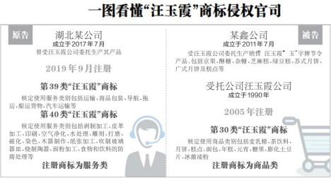 法院审理认为,被控侵权商品包装上使用的“汪玉霞”标识虽与原告涉案注册的商标在文字上相同,但从商品类别上判断,被控侵权商品为糕点,原告主张权利的商标核定使用类别为运输、包装或者加工服务,被控侵权商品与涉案商标核定使用的服务类别既不相同也不相类似。因此,被控侵权商品并非侵害原告注册商标专用权的商品。