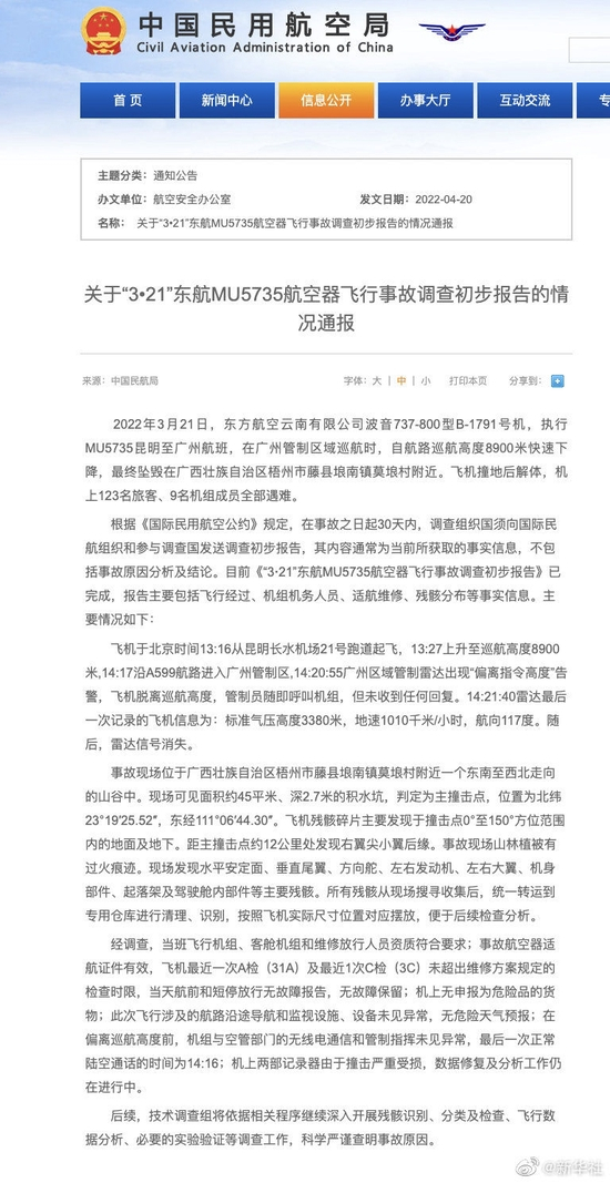 4月20日中国民航局发布了“3•21”航空器飞行事故调查初步报告的情况通报,初步报告已完成,报告主要包括飞行经过、机组机务人员、适航维修、残骸分布等事实信息。