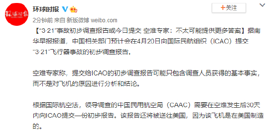 [“3·21”事故初步调查报告或今日提交 空难专家:不太可能提供更多答案]#空难专家解读初步报告# 据南华早报报道,中国相关部门预计会在4月20日向国际民航组织(ICAO)提交“3·21”飞行器事故的初步调查报告。