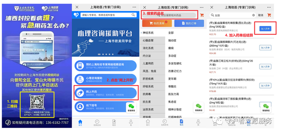 “上海健康云”公众号菜单栏,或下载“健康云”app,点击“互联网医院”->“复诊配药”,进一步选择科室医生,填写复诊信息,绑定医保卡,医生可线上诊疗开具药品清单。