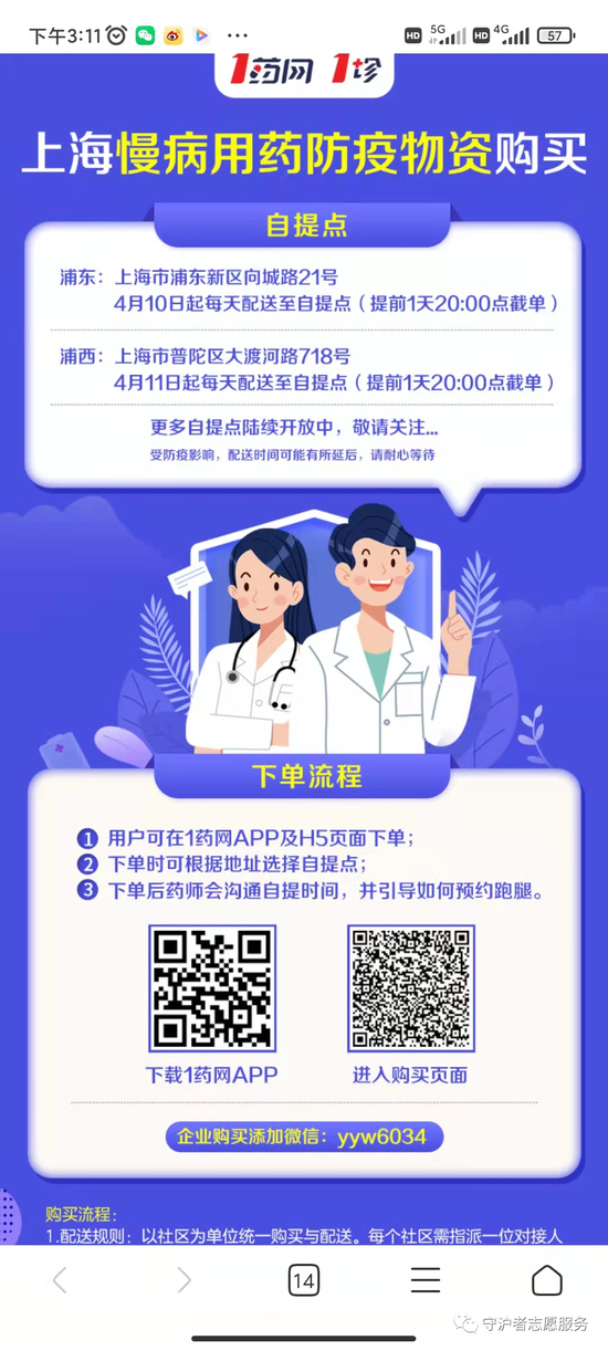 4月12日成功购药案例:出示处方单(之前用过的也可以,没有纸质版就在医院的微信服务号的个人中心那里找一下)才可以下单,在药师指导下沟通自提或跑腿,浦东、浦西都有网点(地址见上图左一)。