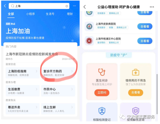 在支付宝首页点击“上海一站式防疫服务”,或在支付宝搜索“上海”,点击“复诊开方购药”