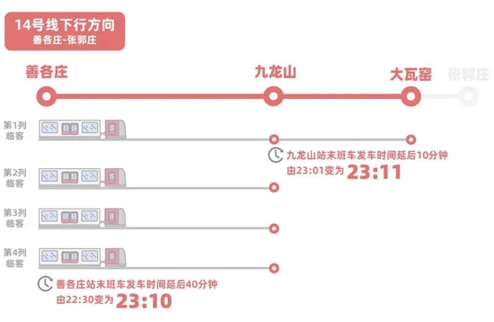 本次延长运营,14号线下行方向将加开4列临客,其中善各庄至大瓦窑区段加开1列临客,善各庄至九龙山区段增加3列临客。善各庄站末班车发车时间由原来的22:30变为23:10,延后40分钟,行车间隔10分钟,共计覆盖13个车站(善各庄站到九龙山站);九龙山站末班车发车时间由原来的23:01变为23:11,延后10分钟,共计覆盖18个车站(平乐园站到大瓦窑站)。