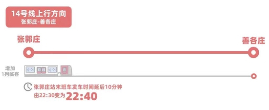 14号线上行方向张郭庄至善各庄区段将增加1列临客,张郭庄站末班车发车时间由原来的22:30变为22:40,延后10分钟,共计覆盖33个车站(张郭庄站到善各庄站)。