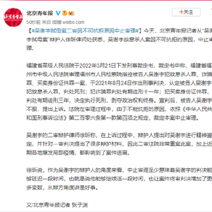 今天,北京青年报记者从“吴谢宇弑母案”辩护人徐昕律师处获悉,吴谢宇故意杀人案因不可抗拒的原因,中止审理。
