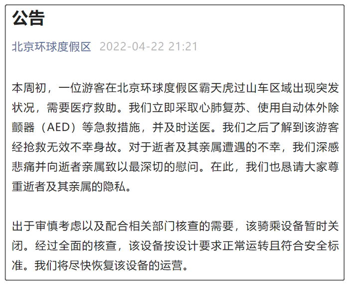 4月22日,北京环球度假区发布一则公告称,本周初,一位游客在北京环球度假区霸天虎过山车区域出现突发状况,需要医疗救助。该度假区立即采取心肺复苏、使用自动体外除颤器(AED)等急救措施,并及时送医。“我们之后了解到该游客经抢救无效不幸身故。”