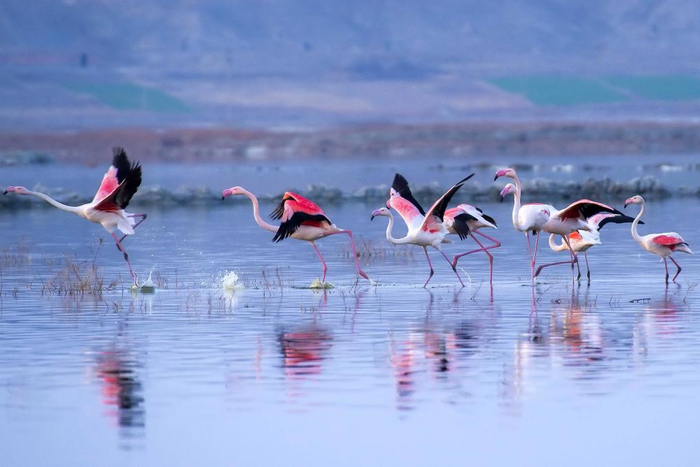 火烈鸟在运城盐湖翩翩起舞。