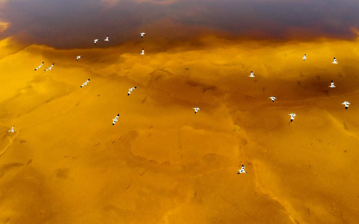 鸟在山西运城盐湖上空飞翔。