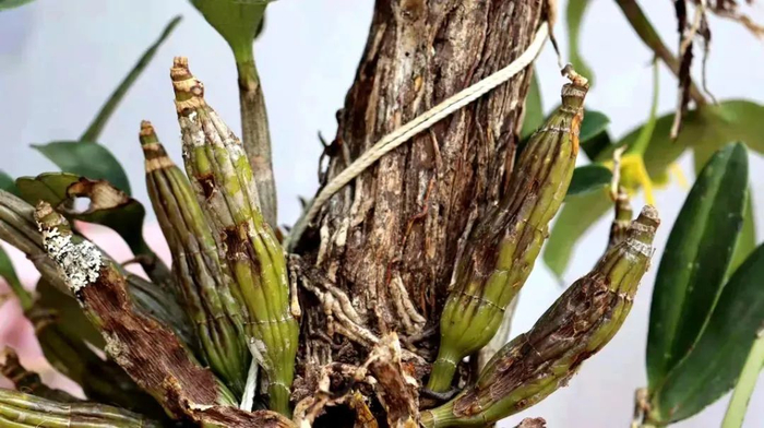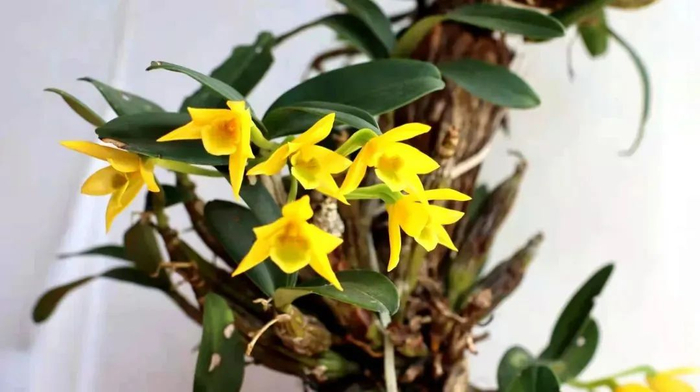 翅梗石斛,茎丛生,肉质状粗厚,不分枝,叶厚革质,3—4枚近顶生,长圆形,常具2朵花,均为蜡黄色,生于海拔1150—1600米的山地林中树干上,分布于中国云南、缅甸、泰国、老挝。每年春末夏初(3—4月)花开,秋冬季节进入休眠期。