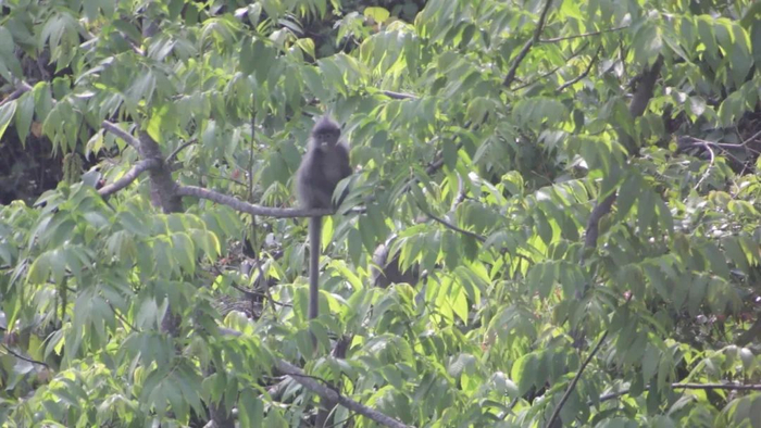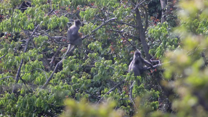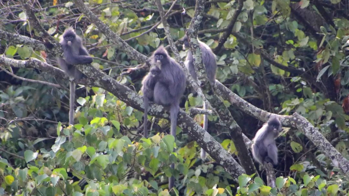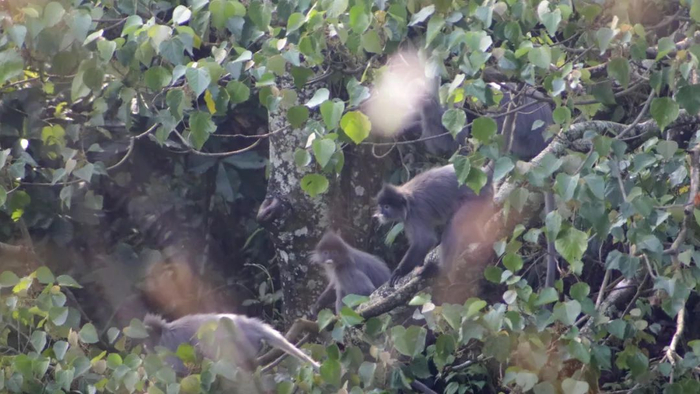在芦子园茂密的森林中,灰叶猴们时而从一棵树敏捷地跳到另一棵树,时而挠着痒痒,时而又采摘野果和树叶吃,好不快活。