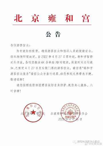 北京:雍和宫4月27日起暂停开放 北京青年报 北京青年报官方账号 2022.04.2611:01 关注 刚刚,雍和宫发布公告称,自2022年4月27日零时起,雍和宫暂停对外开放,各项宗教活动暂时取消,恢复时间另行通知。