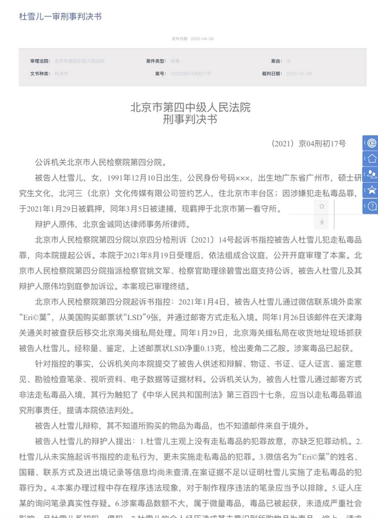 4月25日,有媒体报道“福禄寿”乐队成员之一的杜雪儿涉嫌走私毒品罪获刑一年。封面新闻记者在北京法院审判信息网的裁判文书中发现,确有“杜雪儿一审刑事判决书”一文。