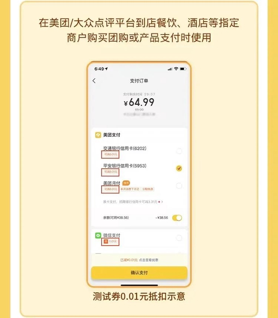 消费券可在美团/大众点评平台餐饮、文体旅游指定商户购买团购或产品支付时使用,选择美团支付或微信支付即可完成抵扣。