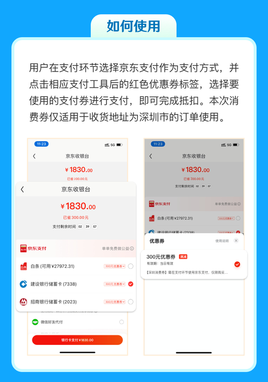 消费券可在京东APP内购买京东自营实物类指定商品,仅限收货地址在深圳市的订单使用。用户在支付环节选择京东支付作为支付方式,并点击相应支付工具后的红色优惠券标签,选择要使用的支付券进行支付,即可完成抵扣。消费券仅限当天有效。