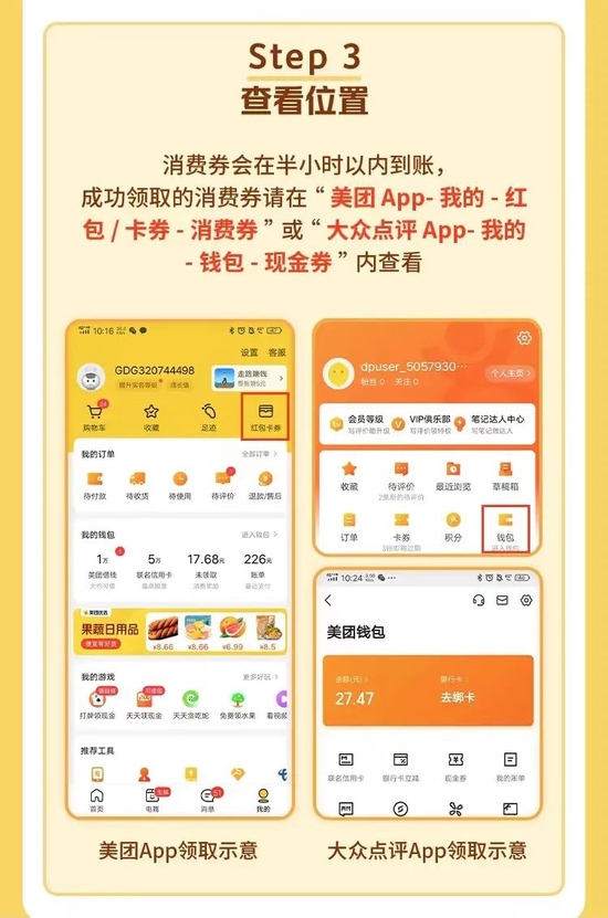 消费券将在半小时内到账,成功领取的消费券请在“美团APP-我的-红包/卡券-消费券”或“大众点评APP-我的-钱包-现金券”内查看。