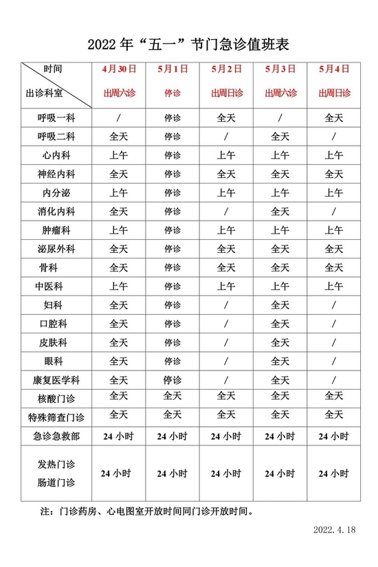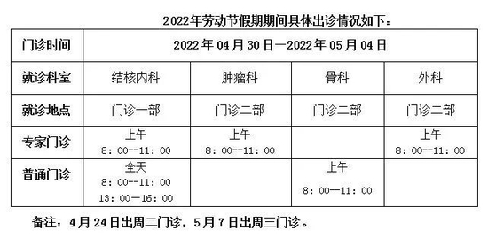 4月30日至5月4日:全日普通门诊,出节假日专家门诊。
