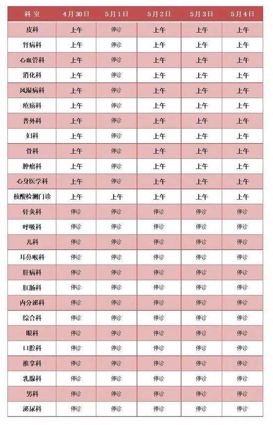 4月30日(周六)、5月2日至5月4日(周一至周三):上午半日门诊,专家+普通