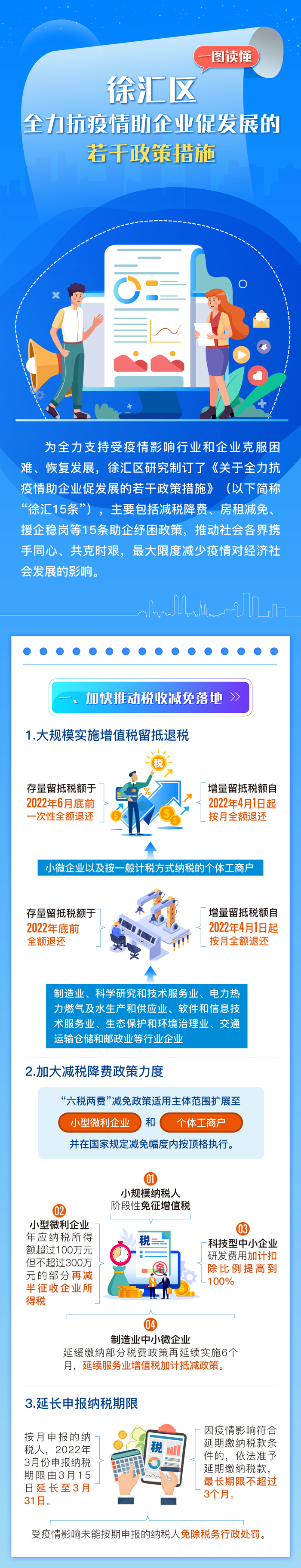 为坚持统筹疫情防控和经济社会发展,上海市政府研究制定了《全力抗疫情助企业促发展的若干政策措施》徐汇区出台的《徐汇区全力抗击疫情助企业促发展的若干政策措施》主要包括减税降费、房租减免、援企稳岗等15条助企纾困政策,详见↓